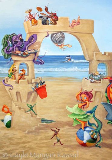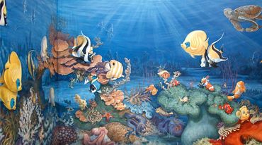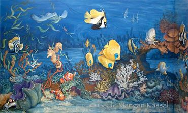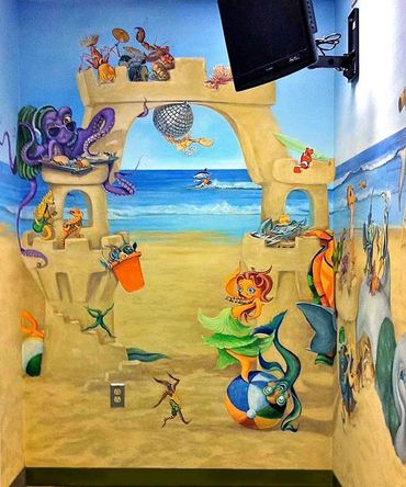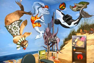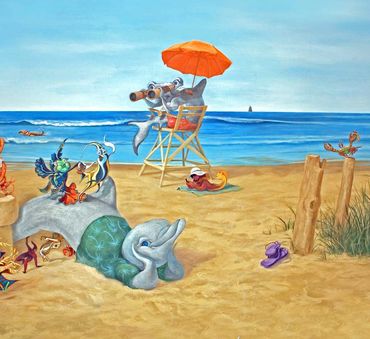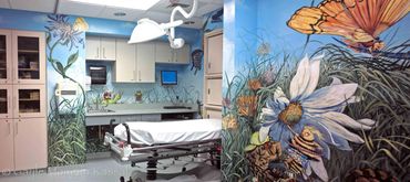 I was honored beyond words. My mural titled "Christine’s World”, a world through the eyes of a child; little Christine’s love for nature, bugs, flowers, butterflies, children’s games, reading and smiles. Her father's love for the Celtics inspired the basketball game and is my secret meaning behind choosing the "green" grasshopper. The mural helped children daily ease their anxiety and aided staff into a wonderful world of seek and find for many years until renovations removed the art.